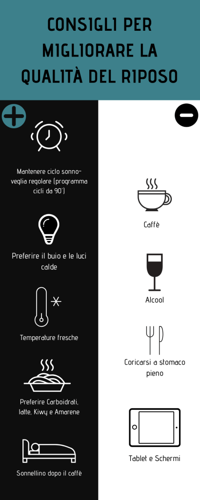 Gestione dell’ambiente, quindi camera da letto, gestione dei comportamenti, cosa fare per favorire un sonno tranquillo e recuperare a sufficienza e gestione alimentare, cosa e quando mangiare.