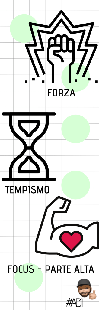I volumi (numero di ripetizioni e serie sono medi/alti) e i recuperi incompleti (il tempo in pausa è importanti almeno quanto le fasi di lavoro) per cercare l’adattamento dei muscoli che ci servono. Non sto qui a spiegare nel dettaglio, ma la scelta è ponderata e se vuoi capire con precisione il perché scrivimi sotto e te lo spiego volentieri, ma non vorrei appesantire troppo la stesura di questo pezzo.